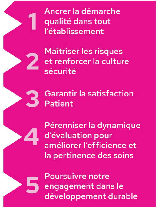 La Politique d’amélioration de la Qualité et Sécurité des soins s’inscrit dans le cadre des orientations stratégiques de l’établissement. Elle repose sur l’analyse de l’existant, la satisfaction aux exigences réglementaires, l’identification des besoins, l‘analyse des risques et les objectifs d’amélioration. Elle se décline en cinq objectifs.