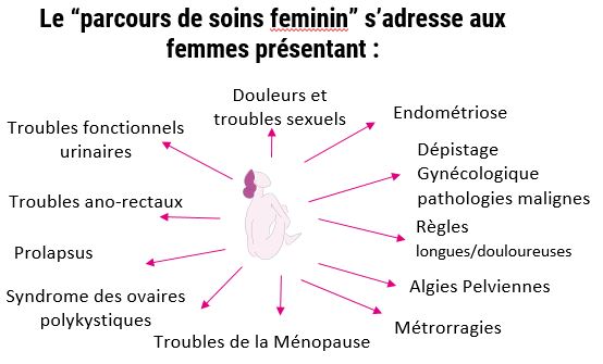 Le « parcours de soins au féminin » avec la présence du Dr VIALARD, de Marion BENOIST (Sage-femme) , de Justine RAYAMOND (Sexologue et kiné pelvienne), de psychologues, nutritionnistes, enseignants en activités adaptées et l’accompagnement d’une infirmière coordinatrice, Mme Roxane MARIOTTI , va pouvoir vous accompagner de la première prise de RDV jusqu’à la résolution de votre problème médical ou chirurgical (hors cancérologie).